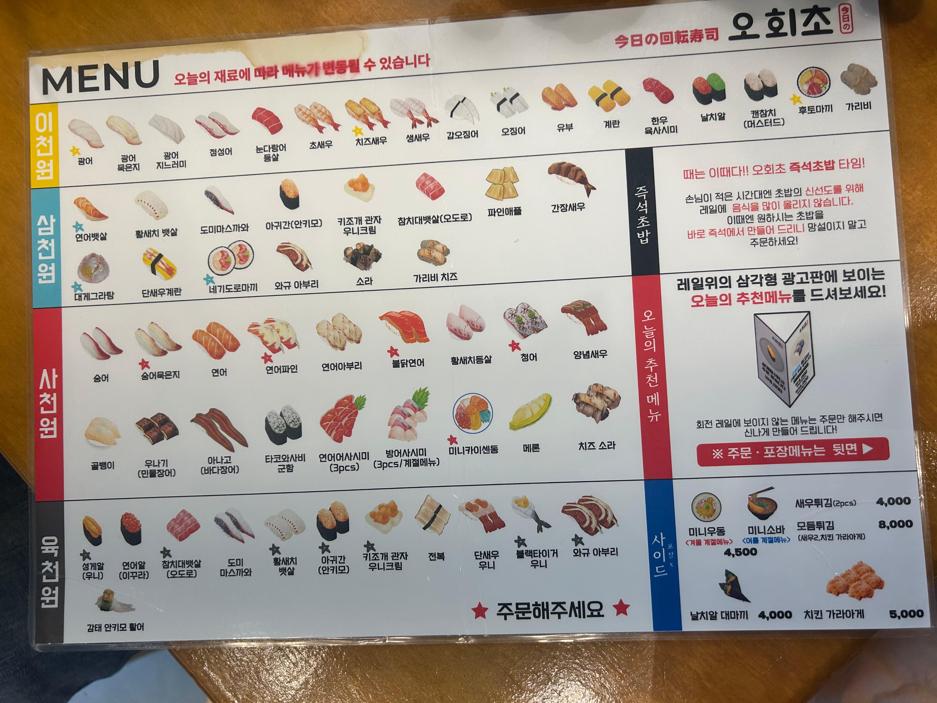 각 테이블마다 메뉴판이 있어 레일에 없는 초밥도 주문하면 바로 만들어 주시더라구요 !